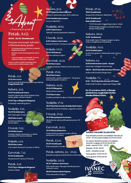 Bit će tu i božićnih filmova, potraga za blagom, kutak za božićno slikanje, koncerata na gradskoj špici i još mnoštva raznih adventskih događanja i sadržaja. Svaki dan donosi nova iznenađenja, pa najbolje da pogledate program u prilogu i otkrijete što vas sve očekuje.