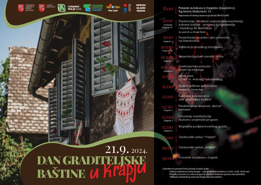 U idiličnom selu Krapje, smještenom unutar Parka prirode Lonjsko polje, 21. rujna 2024. održava se manifestacija posvećena očuvanju i prezentaciji tradicijske graditeljske baštine. Ovo je jedinstvena prilika za sve ljubitelje kulturne i prirodne baštine da uživaju u bogatom programu koji uključuje edukativne radionice, izložbe, gastronomske ponude te kulturno-umjetničke izvedbe. Organizatori manifestacije su Turistička zajednica Sisačko-moslavačke županije, Općina Jasenovac te Udruga mladih Krapje.