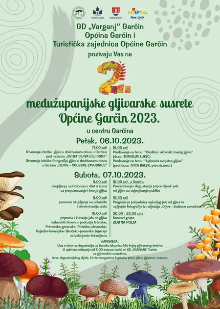 Turistička zajednica Općine Garčin u suradnji s GD „Varganj“ Garčin i Općinom Garčin organizira 2. međužupanijske gljivarske susrete Općine Garčin. Susret počinje 6. listopada od 17 sati otvorenjem izložbe gljiva i izložbe fotografija iz natječaja „Gljive – čudesne zavodnice“ u društvenom domu u Garčinu.
