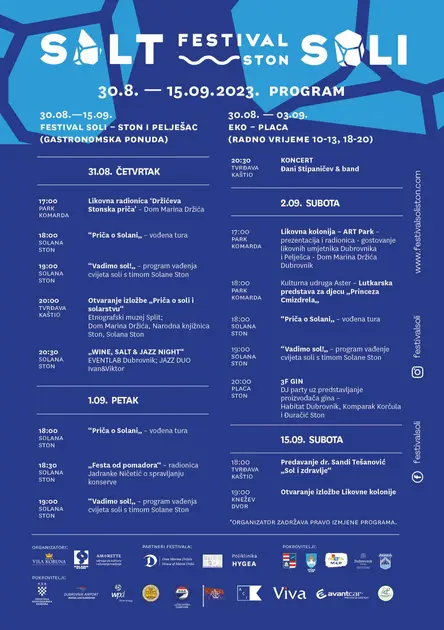 U Stonu se tijekom festivala organiziraju likovne radionice, tradicionalna likovna kolonija, eko plac, tj. sajam tradicionalnih proizvoda, izložbe, vođene ture kroz solanu, kulinarske radionice…, a sastavni dio program Festivala soli 2023. atraktivno je vađenje soli. Glavni dio programa odvija se u središtu Stona do 2. rujna. Očekuju vas i sjajni koncerti: u četvrtak 31. kolovoza – Wine, salt night u Solani Ston, u petak 1. rujna u tvrđavi Kaštio posjetitelje će zabavljati Đani Stipaničev, dok će 2. rujna Ston biti domaćin 3F GIN eventa - DJ partyja na kojem će biti predstavljeni lokalni proizvođači gina.