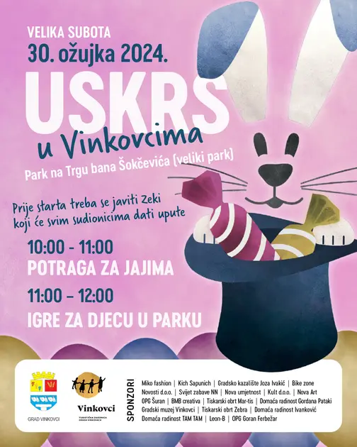 Pridružite se i ove godine Vinkovčanima u zajedničkoj potrazi za uskršnjim jajima.Velika potraga održat će se na Veliku subotu, 30. ožujka, u parku na Trgu bana Šokčevića s početkom u 10 sati. Za sve sretne nalaznike uskršnjih jaja, TZ grada Vinkovaca pripremila je slatke i prigodne poklone koje će razveseliti sve klince i klinceze. Prije starta potrebno se javiti Zeki koji će svim sudionicima dati upute za sudjelovanje.