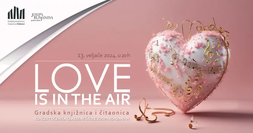 Koncert pod nazivom “Love is in the air” u organizaciji Glazbene škole Josipa Runjanina u Vinkovcima održat će se 13. veljače u Gradskoj knjižnici i čitaonici Vinkovci s početkom u 20 sati. Posjetite koncert i uljepšajte svojoj voljenoj osobi večer.